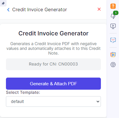 Find the Widget: On the right-hand sidebar of the credit note details page, you'll see the "Credit Invoice Generator" widget. It will automatically start fetching the details of the open credit note.